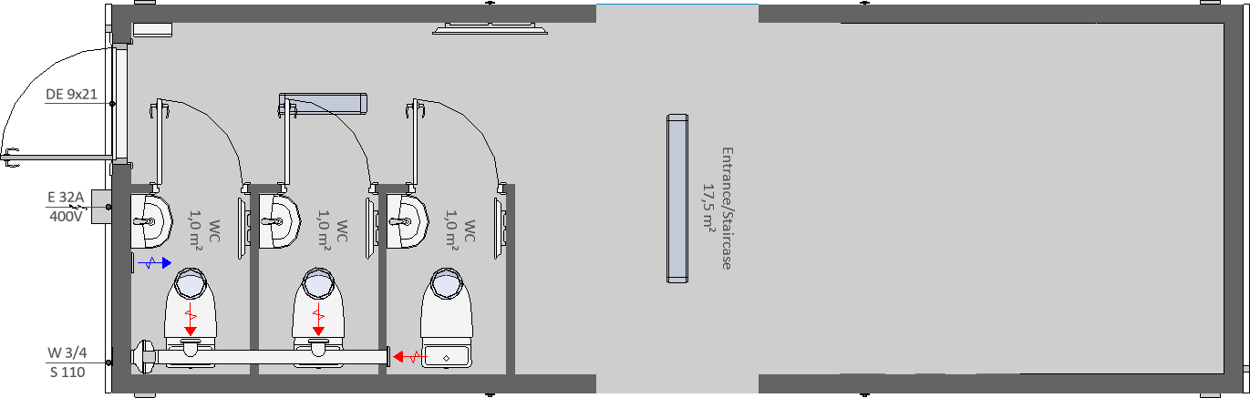 Denna entrébod, som heter E3WC, följer bodstandard med öppningar på långsidorna vilket gör att den passar in i alla möjliga konfigurationer tillsammans med andra bodtyper. Det som är unikt med denna bod är att den har även en öppning på ena kortsidan. I större bodetableringar kan det vara bra med flera alternativa entréer förutom de på vardera ände av bodetableringen.